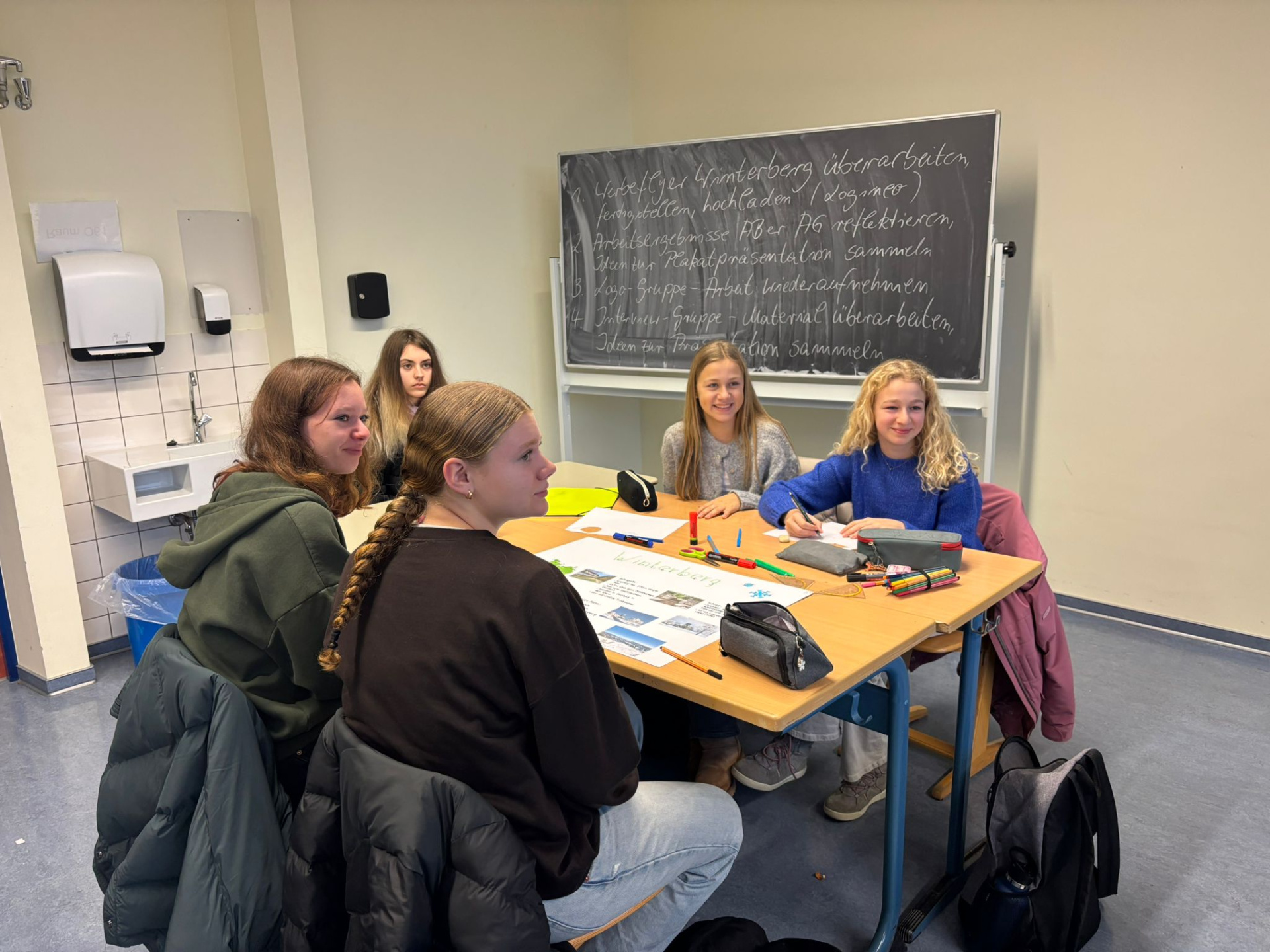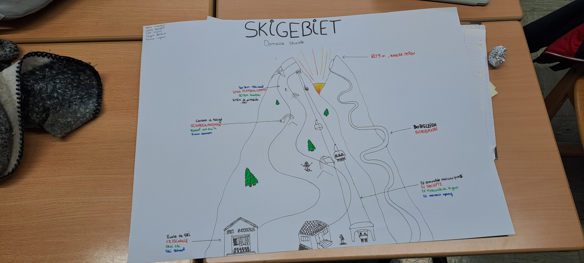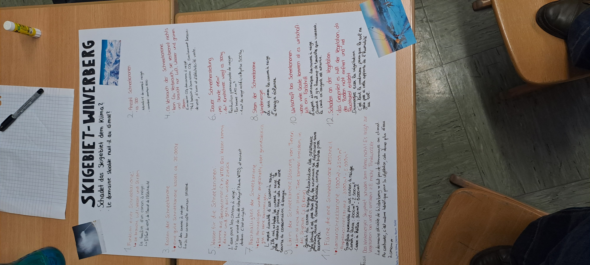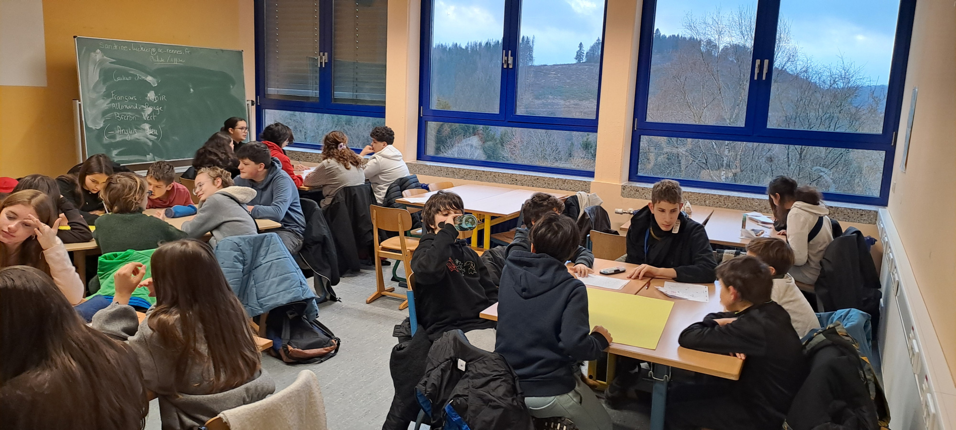 Une journée qui débute avec un goût de « dernière ». Ils ont tous à coeur d’en profiter. Le programme de la matinée est la réalisation des affiches pour l’exposition « Winterberg, Winter, Berge, Tourismus, Wirtschaft und Umwelt », le logo de l’échange franco-allemand et un imagier en 4 langues « Französisch, Deutsch, Bretonisch und Englisch » pour les plus jeunes.