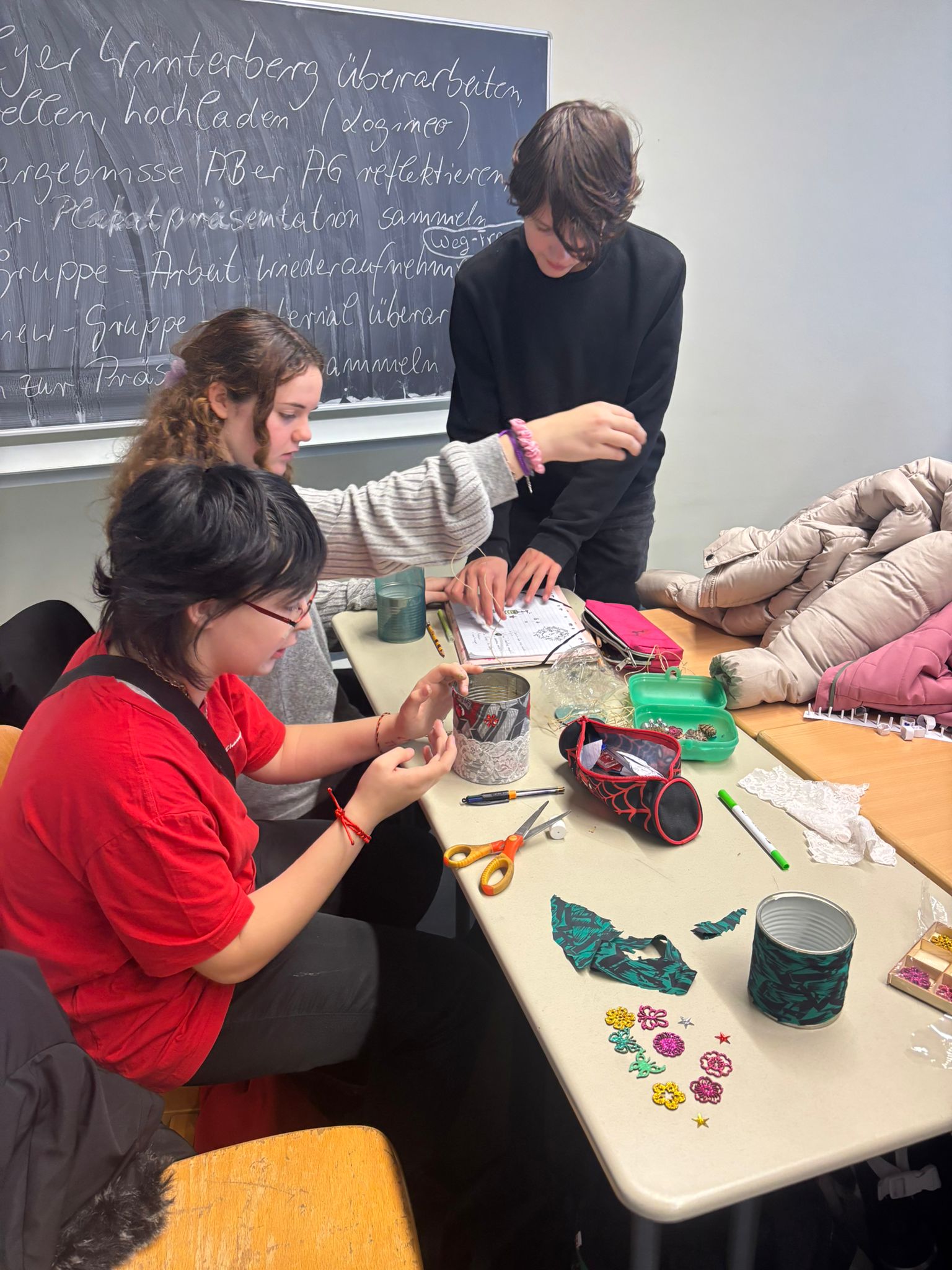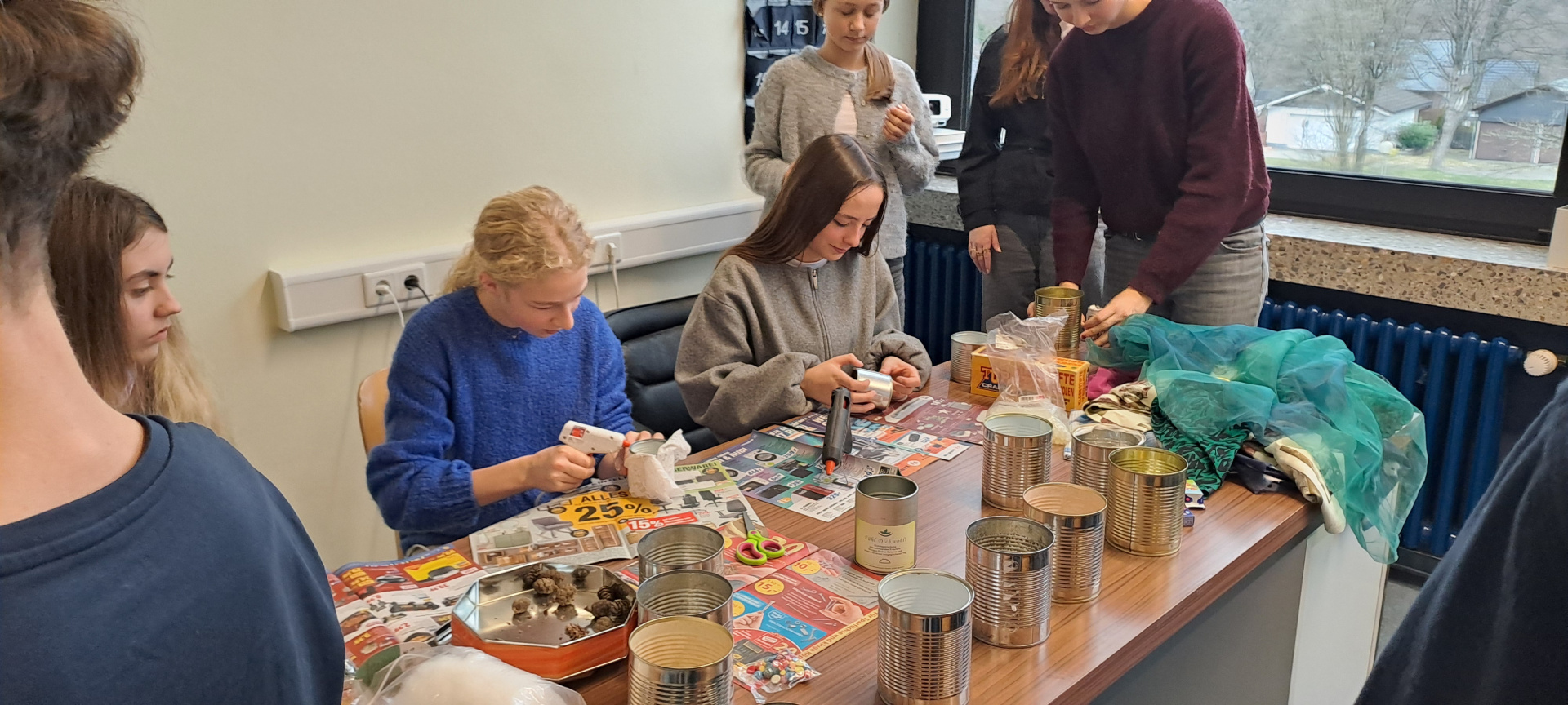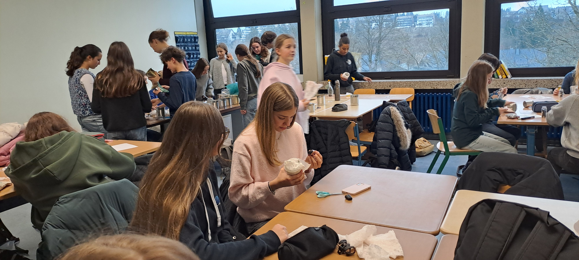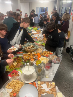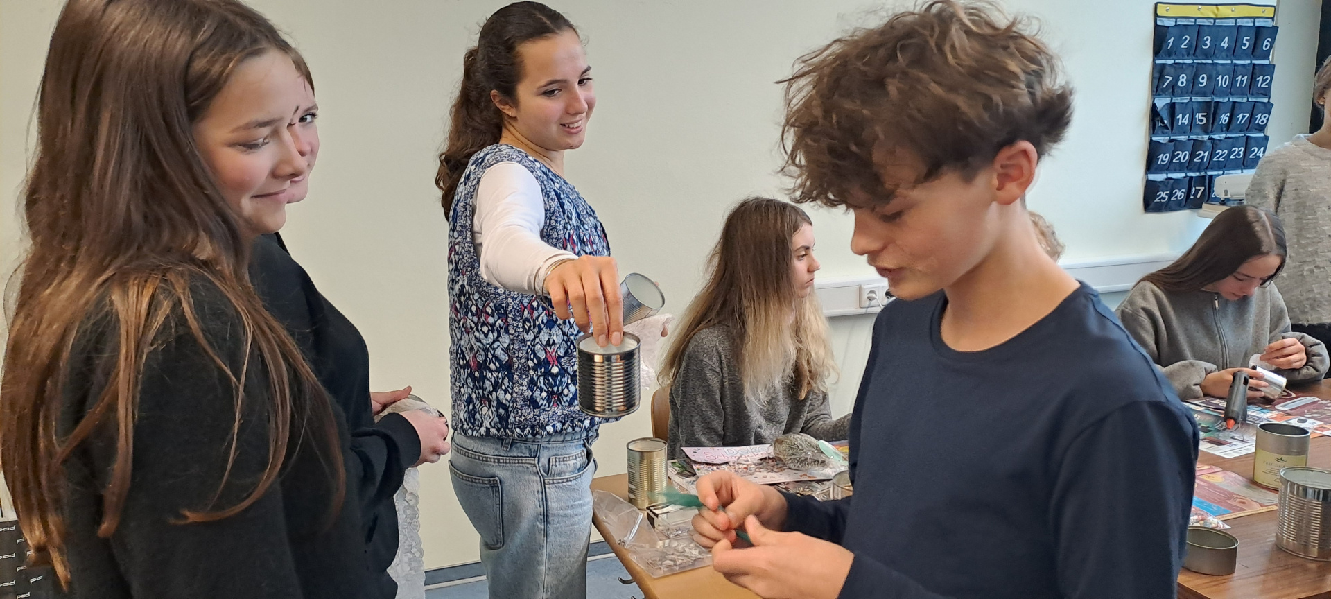 Cette après-midi, nous confectionnons des objets décoratifs de Noël à partir de boîtes de conserve, journaux, cintres en fer et calendriers… Puis, nous profitons des gourmandises préparées par les familles pour fêter cette superbe semaine emplie de rencontres, de découvertes…